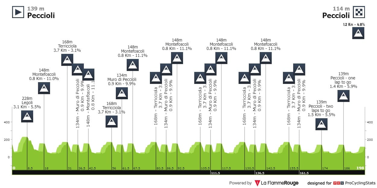 Análise ao percurso: Um sobe e desce constante, típico de uma clássica italiana. A destacar a subida Montefoscoli que será ultrapassada por cinco vezes pelos ciclistas ao longo dos quase 198 quilómetros. São 800m a 11.1%, não é brincadeira.