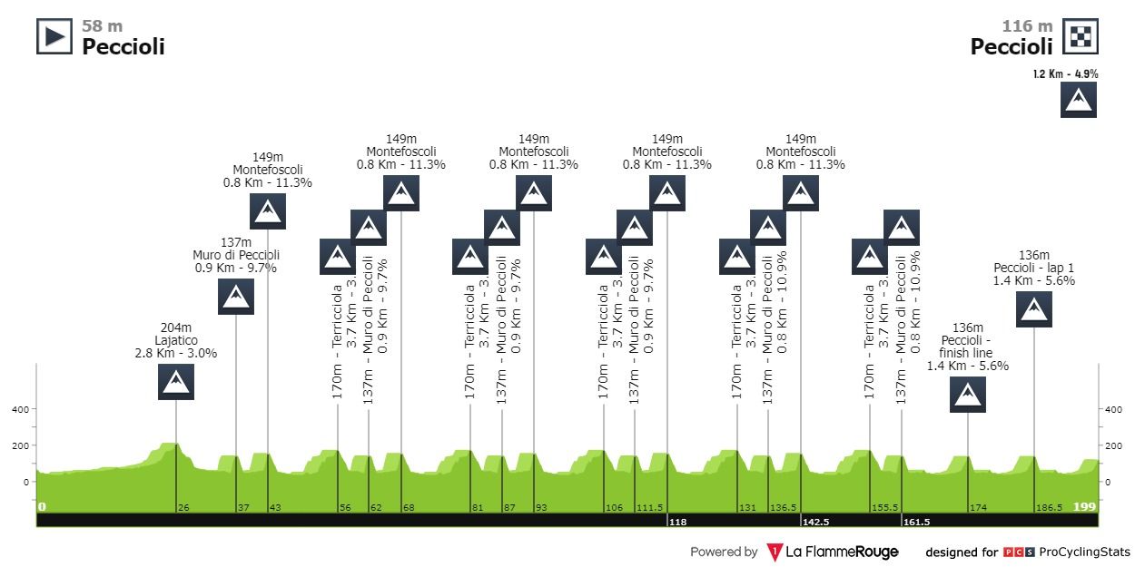 Análise ao percurso: Aquela piú bella clássica italiana. Vai dar molho, com certeza. Carbonara ou de tomate, sabe-se lá. Atenção a esta parede que os ciclistas vão passar várias vezes, Montefoscoli (0.8km a 11.3%). O final é mais um mini topo na cidade de Peccioli. Isto fazia-se bem era de Piaggio.