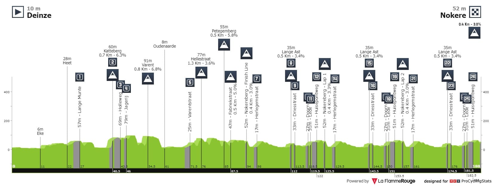 Análise ao percurso: Esta é uma clássica que embora com muita história, tem também vindo de ano para a ano a inovar-se. Este ano, embora a partida e a chegada se mantenham intactas, iremos contar novamente com algumas aterações no percurso: a redução dos setores de pavé — 30 para 26 — e o número de quilómetros — 193 para 188 — são algumas das mudanças em que a organização acredita que irá tornar a corrida mais atrativa. Resumindo: Serão 26 setores de pavé que no total perfazem uma distância de 25 quilómetros e um total acumulado de 1207 metros, distribuídos ao longo de 13 subidas, 8 das quais em pavé. Terminado o setor 26, os corredores terão apenas 3 quilómetros para o já habitual final em Nokere.