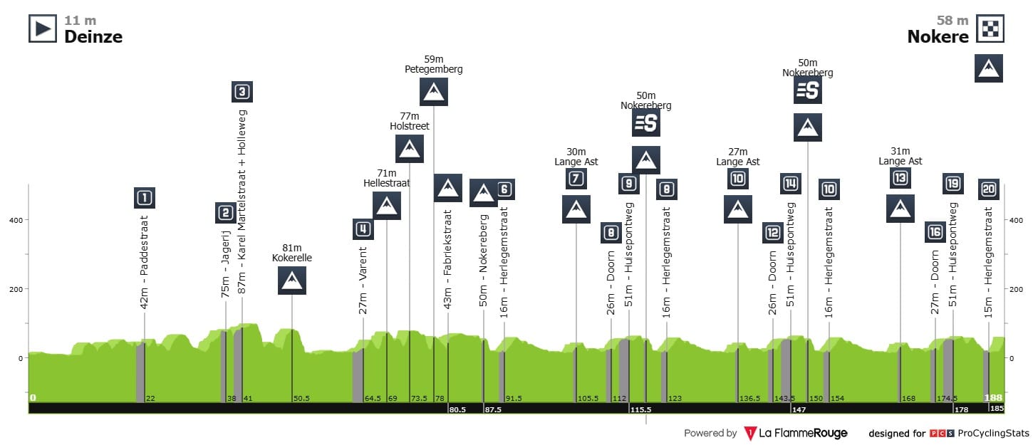 Análise ao percurso: Uma tradicional clássica por terras belgas, tem colinas, tem empedrado e tem possível sprint. Este ano, o percurso volta a sofrer alterações. Continua a ser uma clássica com muitas colinas, muito sobe e desce por muitas ruas estreitas, mas voltámos a ter redução de setores de pavé — de 26 para 20. A quilometragem mantém-se praticamente a mesma, mas a maior mudança é mesmo no final. Temos 188 quilómetros, dos quais os últimos 100 são em circuito com três passagens. A passagem na primeira vez, no Nokereberg coincide com a entrada no circuito de 31.3 quilómetros, no qual dão duas voltas completas. Na terceira volta, o circuito passa para 37.8 quilómetros, e aí teremos o nosso final diferente. Deixamos de ter o final em subida com pavé no Nokereberg, que já vinha a ser tradicional, e vamos para outra vertente do Nokereberg, em asfalto — apenas para o final, já que durante o circuito passam no antigo final.