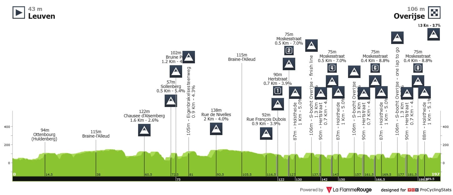 São mais de 20 subidas (e descidas) e 8 sectores de pavé, com destaque para as duas subidas empedradas no circuito de Overijse: Hertstraat (700m @ 3.8%) e Moskesstraat (500m @ 8%).