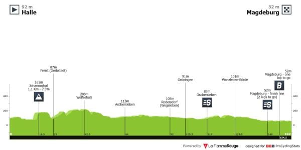 Etapa 1 — Mais um sprint desta vez em pelotão compacto, apesar de ter um sprint bónus em subida (400 metros a 4,6%) a 7 quilómetros da meta.