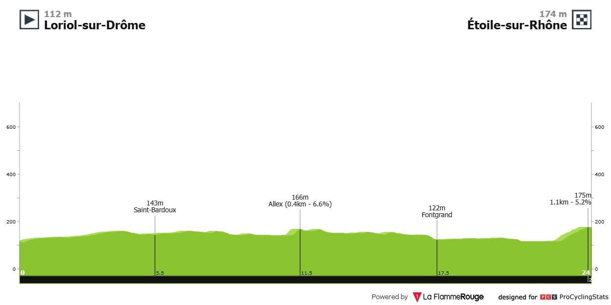 Análise ao percurso: De Loriol-sur-Drôme a Étoile-sur-Rhône são vinte e quatro quilómetros praticamente planos apenas com uma ligeira subida na aproximação à meta, com o último quilómetro a ter uma pendente a rondar os cinco por cento.