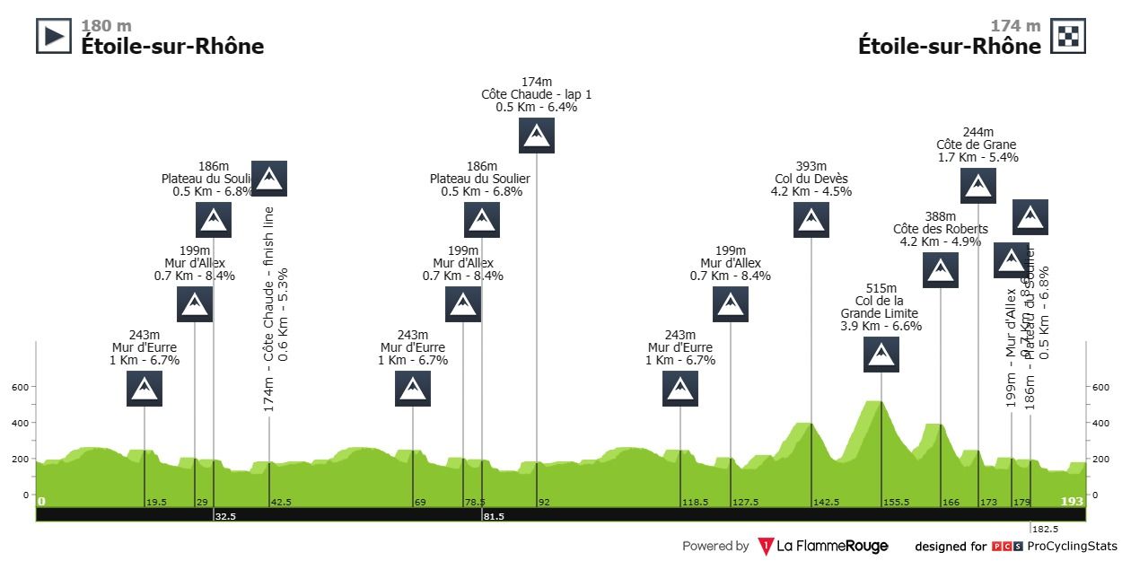 Esta clássica é uma corrida com alguma dureza — são cerca de 16 subidas, entre os curtos muros de Mur d'Eurre (1km @ 6.7%), Mur d'Allex (0.7km @ 8.4%) e Plateau du Soulier (0.5km @ 6.8%) e outras subidas um pouco mais longas mas menos duras como Col du Devès (4.2km @ 4.5%), Col de la Grande Limite (3.9km @ 6.6%) e Côte des Roberts (4.2km @ 4.9%) — e o histórico recente mostra uma tendência para o vencedor finalizar a solo. Este ano espera-se muito vento o que pode causar o caos — adoramos abanicos — e se o vento bater de frente aumenta exponencialmente a probabilidade de terminar ao sprint.