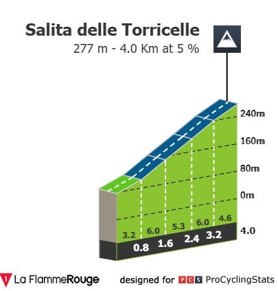 Não se deixem enganar, a ascensão da Salita delle Torricelle não é tão dura como o perfil aparenta visualmente mas tem tudo para dar espetáculo, tal é a presença de tantos e tão bons puncheurs que vão querer deixar os poucos sprinters para trás.