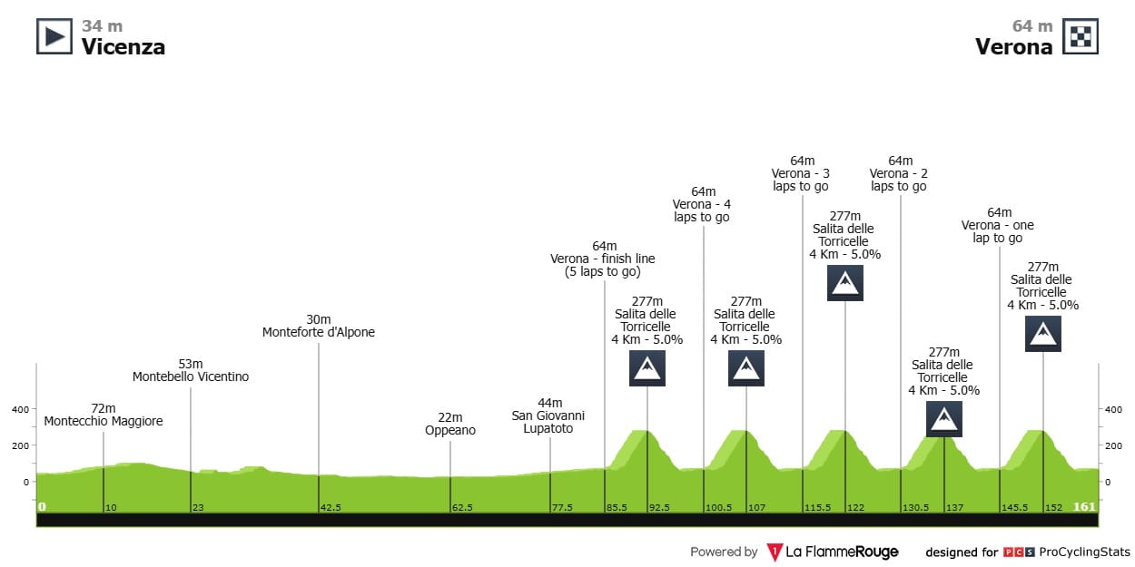 Análise ao percurso: Passeio de 85 quilómetros em plano entre Vicenza e Verona. Depois começa a ação no circuito da cidade, que começa na Porta Nuova e termina perto da Arena di Verona, o monumental anfiteatro romano que data do ano 30 AD. Este circuito vai contemplar o pelotão com cinco passagens pela Salita delle Torricelle (4km @ 5%), que permite uma vista privilegiada sobre a belíssima cidade de Romeu & Julieta na passagem pelo Castel San Pietro.
