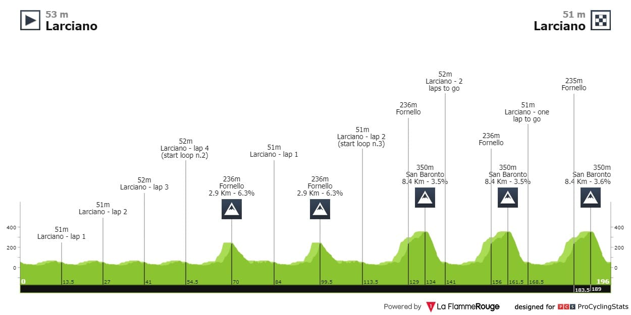 Análise ao percurso: clássica italiana para puncheurs com o habitual circuito em redor de Larciano — nesta edição sobem duas vezes o Fornello (o último quilómetro ronda os 10%) e três vezes o San Baronto (o terceiro quilómetro tem praticamente 10% de pendente média, seguido de um falso plano de cinco quilómetros). Normalmente termina em sprint de grupo reduzido — na última edição Ben Healy venceu com um solo de 15 quilómetros.