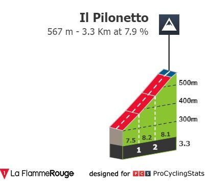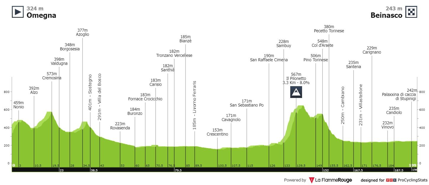 2022, por sua vez, é uma edição de 198 quilómetros que começa em Omegna e termina em Beinasco. Tem algumas subidas não categorizadas logo a abrir a prova, onde a fuga se deve estabelecer e depois, a 65 quilómetros da meta, temos uma subida de 3.3km a 7.9% de pendente média. 'Tou? Está aí alguém? Pois. Será o Il Pilonetto suficiente para afastar os grandes sprinters da vitória?