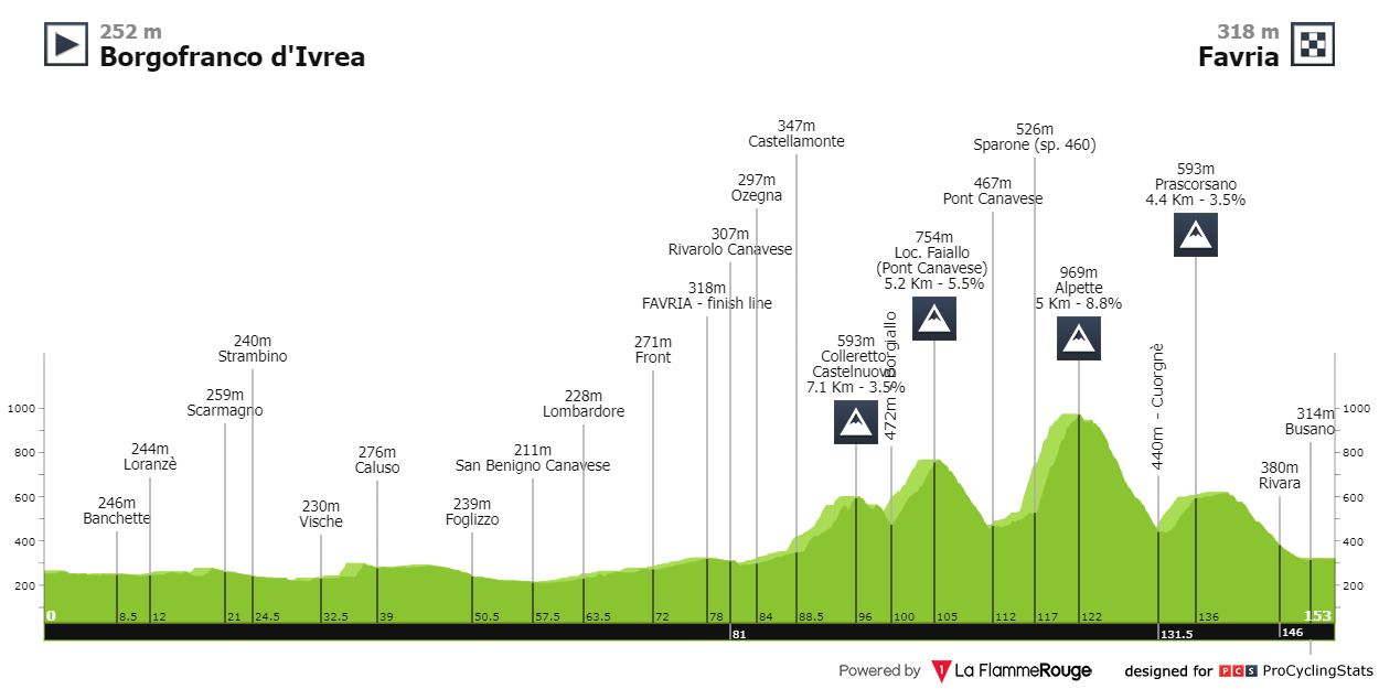 Análise ao percurso: Com um perfil de sobe e desce apenas nos últimos setenta quilómetros e apenas uma das quatro ascenssões a ser mais dura (Alpette: 5km @ 8.8%) e a ser a cerca de trinta quilómetro da meta, creio que podemos ver um grupo restrito a lutar ao sprint pela vitória final.