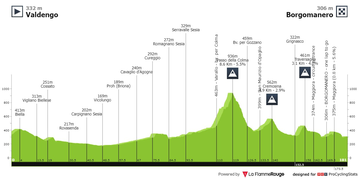 Análise ao percurso: É um percurso um tanto ou quanto esquisito, visto que as principais dificuldades se encontram ainda muito longe da meta, nomeadamente o Passo della Colma, que tem o seu fim a mais de 60 quilómetros da chegada. Em seguida, ainda há mais duas subidas "categorizadas", a última a 23 quilómetros da meta, com as quais só não gozo por ser um apreciador tão profundo deste tipo de terreno, normalmente denominado de falso plano. A chegada é em ligeiríssima subida e, dado o percurso, a corrida pode ser discutida por ciclistas de vários perfis. Ótimo para o espetáculo, péssimo para os fantasistas. Para terem noção da amplitude de possibilidades de vencedor, nos últimos 5 anos lendas do ciclismo com características tão distintas como Egan Bernal e Iván García Cortina venceram aqui.