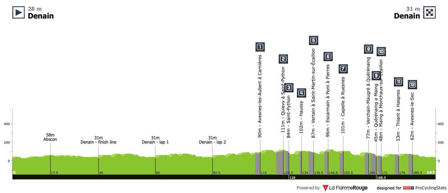Análise ao percurso: Apesar dos cerca de 20 quilómetros de empedrado que o Grand Prix de Denain tem apresentado sistematicamente no seu percurso, a prova tem acabado por gerar um sprint em pelotão compacto — ou pelo menos numeroso. O ano passado, nem a presença de Roglič na preparação para o pavé que a edição transacta da Volta a França continha foi suficiente para desfazer a disputa da corrida pelos homens mais rápidos. O camião Max Walscheid foi o mais forte. Jasper Philipsen, Arnaud Démare (por duas vezes), Mathieu van der Poel, Nacer Bouhanni (por duas vezes), são outros nomes que constam no palmarés da clássica francesa.