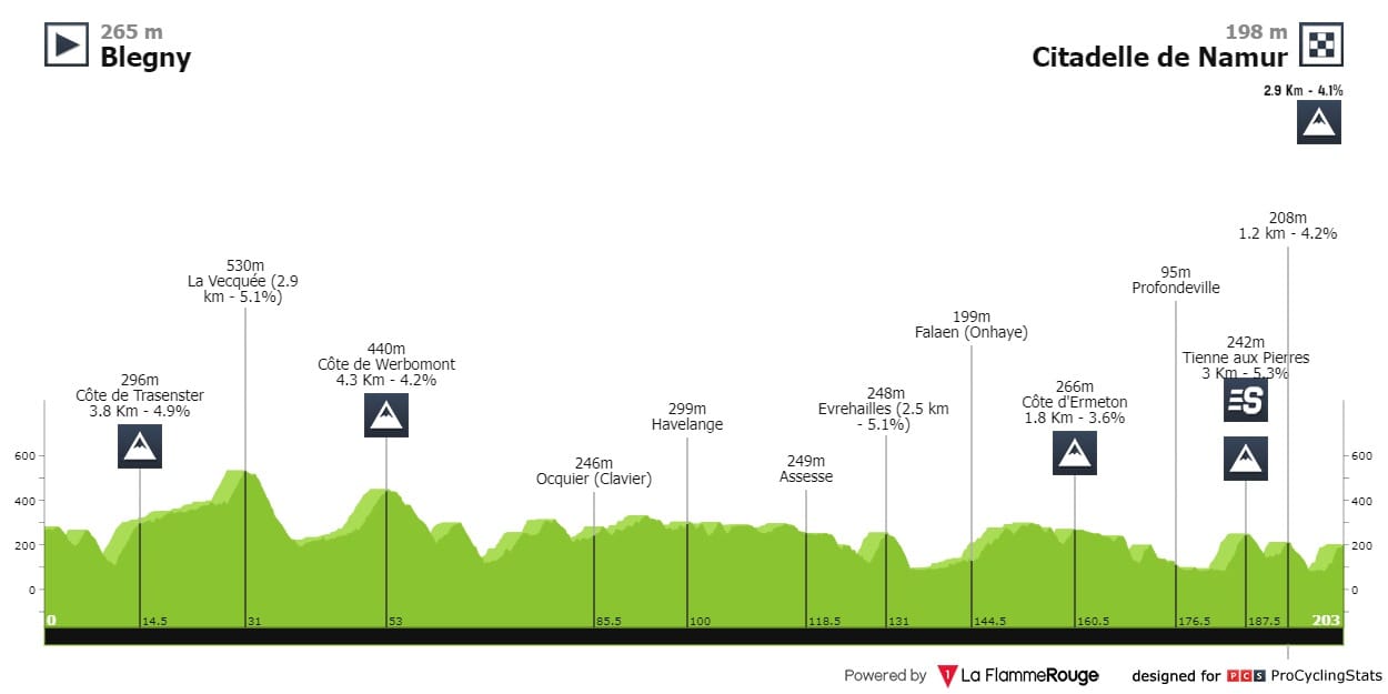 Análise ao percurso: É o percurso do costume, uma clássica explosiva na Valónia com vários topos na fase final da corrida que termina na Cidadela empedrada de Namur. É dia para classicómanos puncheurs.
