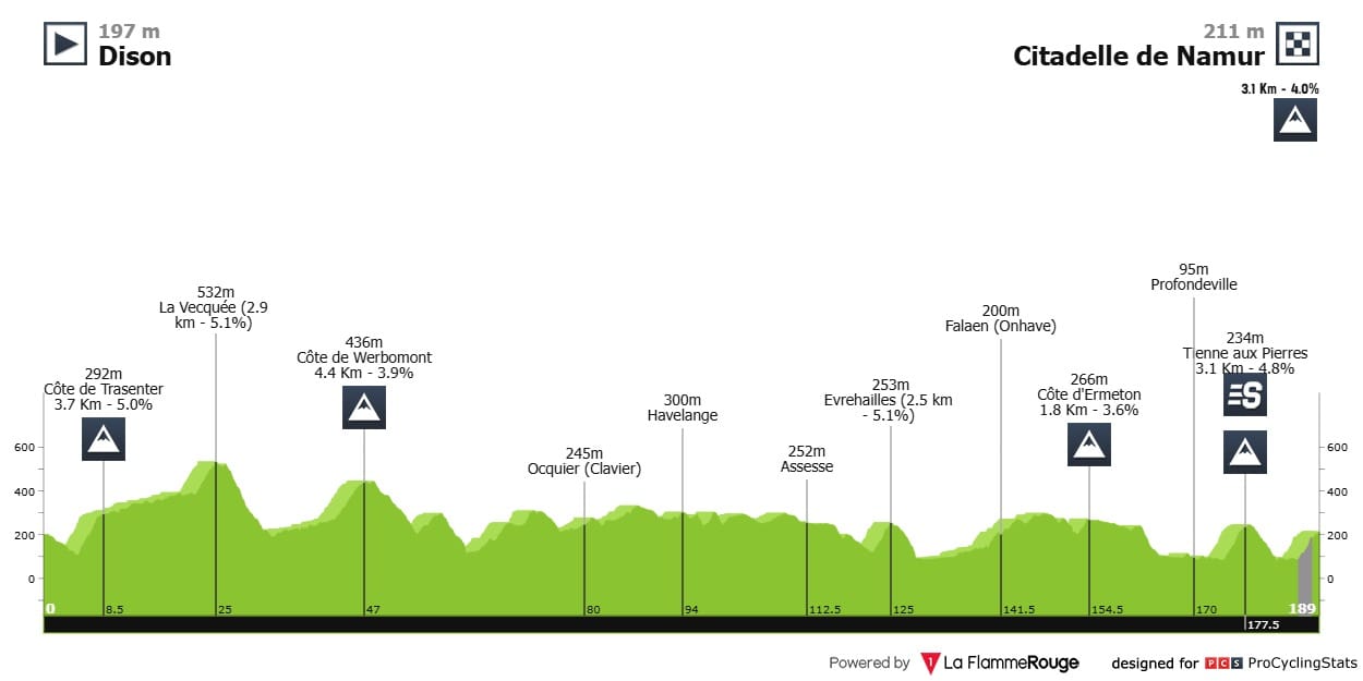 A alteração é o desaparecimento de uma subida de 1,2 km a 4,2%, uma subida que ficava entre a Tienne aux Pierres e a subida final na Citadelle de Namur. Este final retira um pouco de dureza, o que poderá dar mais motivação a sprinters como De Lie e Girmay.