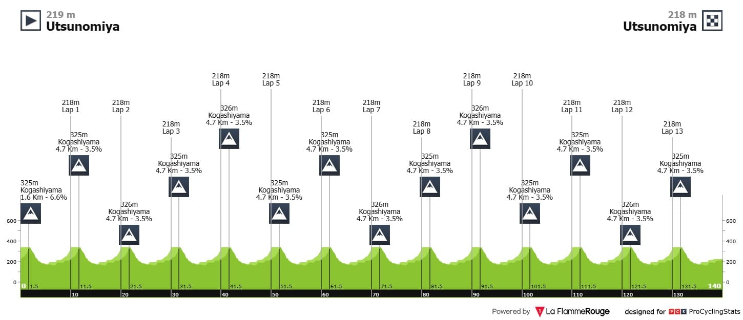 É um percurso curto, com apenas 144.200 metros de extensão e que conta com 14 subidas ao pequeno muro de Kogashiyama, uma subida com 4 quilómetros de falso plano seguidos de 700 metros acima dos 10%. A última passagem por esta pequena dificuldade é a cerca de 10 quilómetros da meta.