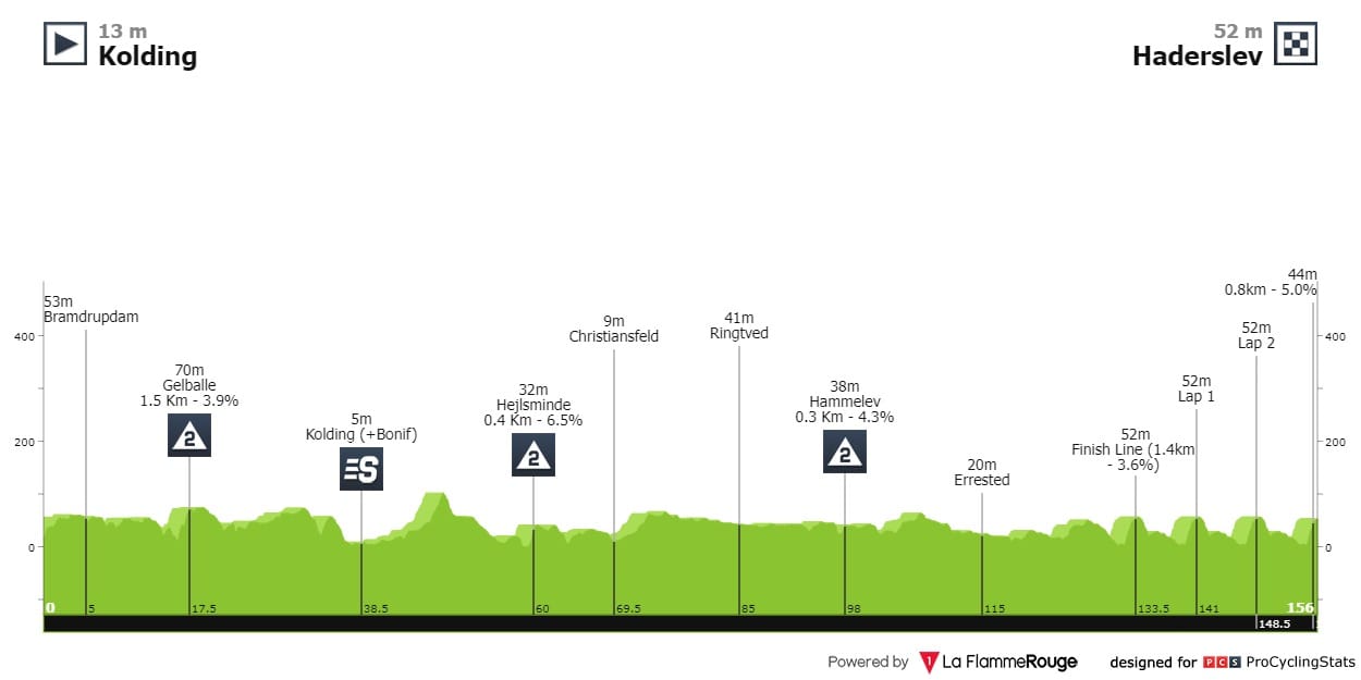 Etapa 3 — Termina num circuito de três voltas em Haderslev com o último quilómetro inclinado, ideal para sprinters puncheurs.