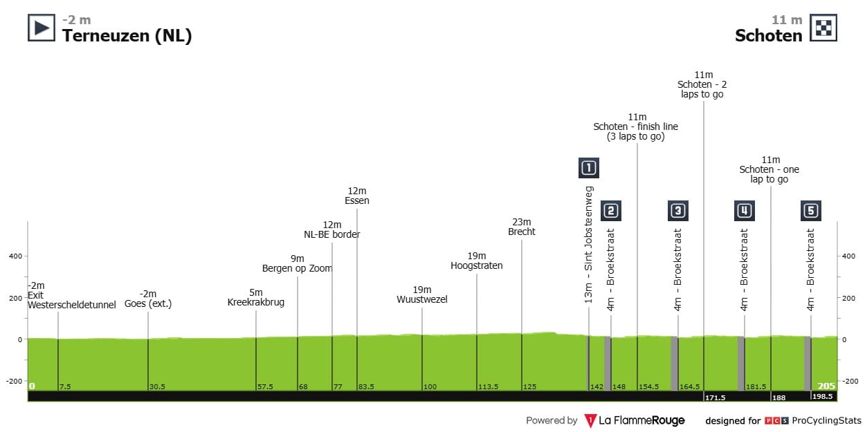Análise ao percurso: São 205 quilómetros que começam nos Países Baixos e terminam na Flandres. E, por isso mesmo, há paralelo, claro. O percurso final, de quatro voltas de 16.9 quilómetros, tem como ponto central o Broekstraat, um sector de empedrado de pouco mais de dois quilómetros e a bonita entrada em Schoten, com uma zona junto às margens do Rio Schelde (Rio Escalda, em português) — um rio de mais de 350 quilómetros de extensão nascido em França, que vagueia pela Bélgica e pelos Países Baixos e cujo curso e legado está intimamente ligado à história desta Scheldeprijs.