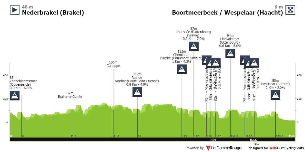 Análise ao percurso: Percurso típico de uma clássica belga em que iremos ter puncheurs vs sprinters a disputar a vitória. Os topos não são duros e os quilómetros finais são planos.