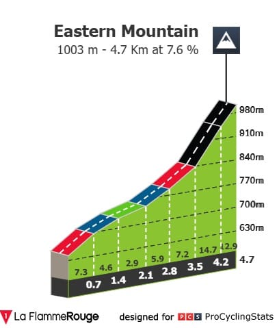 A terceira etapa tem toda a dificuldade instalada no último quilómetro. A Eastern Mountain tem um perfil de 4.7 quilómetros a 7.6%, mas a verdadeira dureza fica para os últimos metros. Ou seja, as diferenças podem não ser assim tão avassaladoras.
