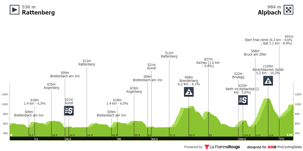 - Etapa 1: Etapa curta, com 128 quilómetros, onde a dureza só aparece a partir do quilómetro 70. Os últimos vinte quilómetros são diabólicos: começam com a subida a Kerschbaumer Sattel (segunda categoria: 5.2km a 10.2%) seguidos de cinco quilómetros a descer para voltar a subir nos últimos, sendo que o derradeiro tem uma inclinação média a rondar os 9%. Primeira batalha pela classificação geral.