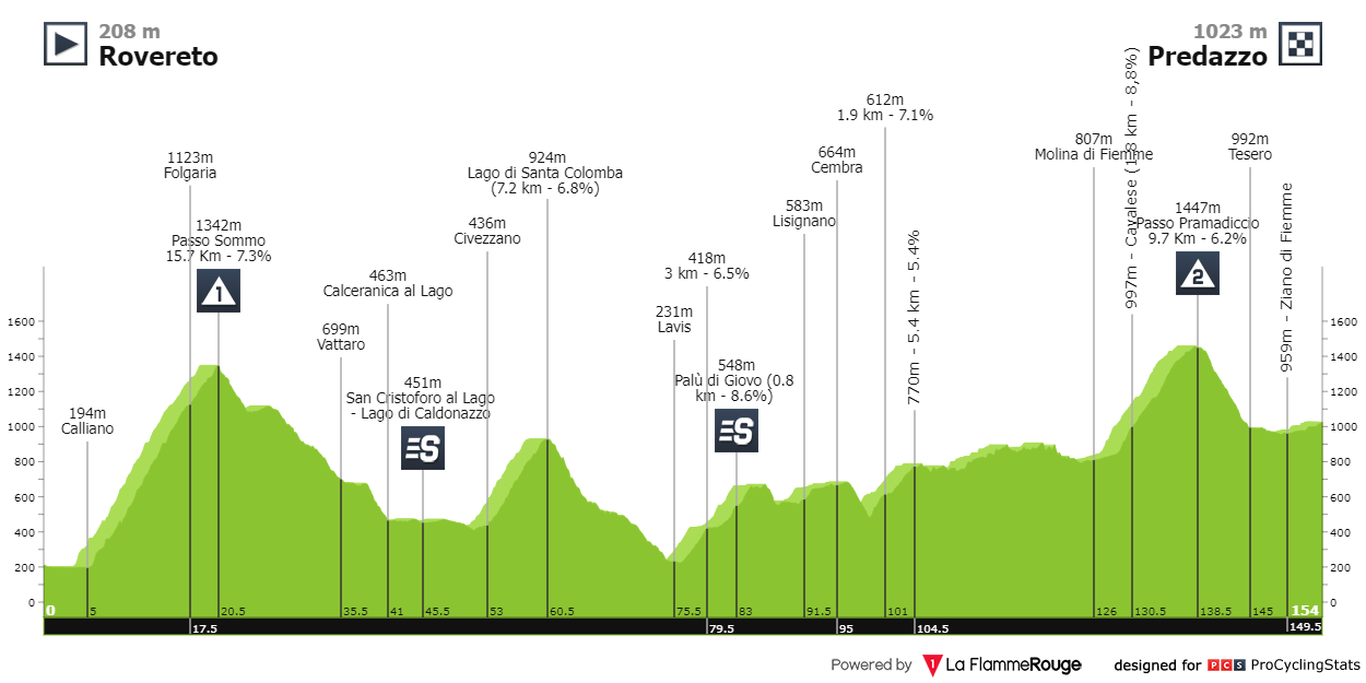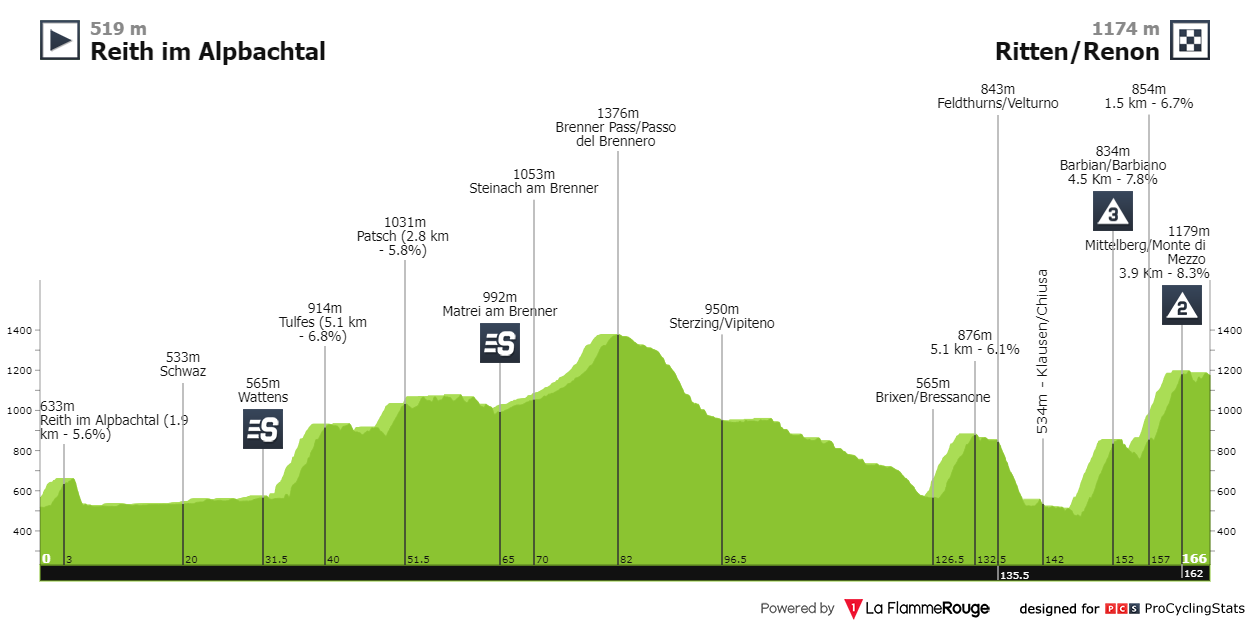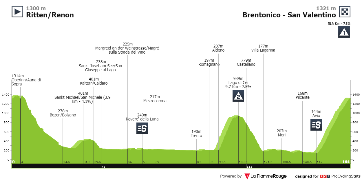- Etapa 2: A etapa começa aos 500 metros de altitude e vai subindo gradualmente até aos 1400 metros, no Passo del Brennero, aos 82 quilómetros, para descer praticamente durante outros e quase voltar aos 500 metros de altitude. Os últimos 20 quilómetros consistem em duas subidas consecutivas, com os últimos quatro quilómetros já sem grande dureza. Sprint entre os homens da fuga.