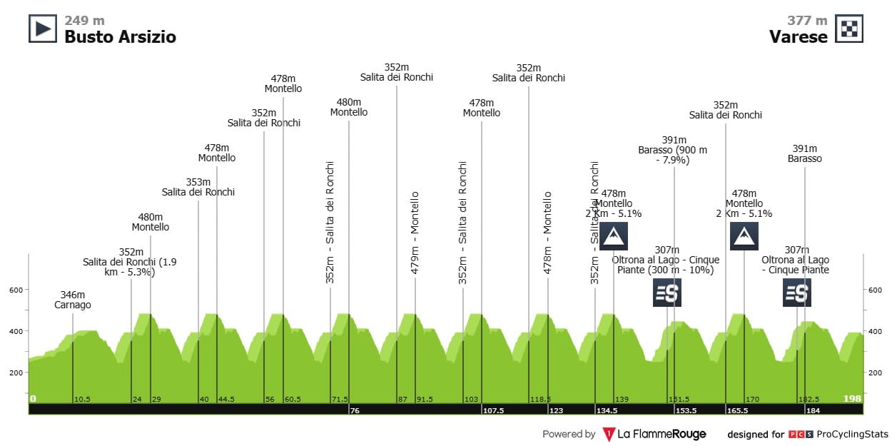 Análise ao percurso: Desta vez vamos até Varese, para a última semi-clássica do Trittico Lombardo. São 200 quilómetros com quase 3400 metros de acumulado num percurso que se inicia em Busto Arsizio e depois anda às voltas num circuito à volta da cidade, cada uma delas contemplando os corredores com uma subida ao Montello (2000m @ 5.2%). As últimas duas voltas têm também a rampa de Barasso (900m @7.9%), mais curta e mais inclinada.