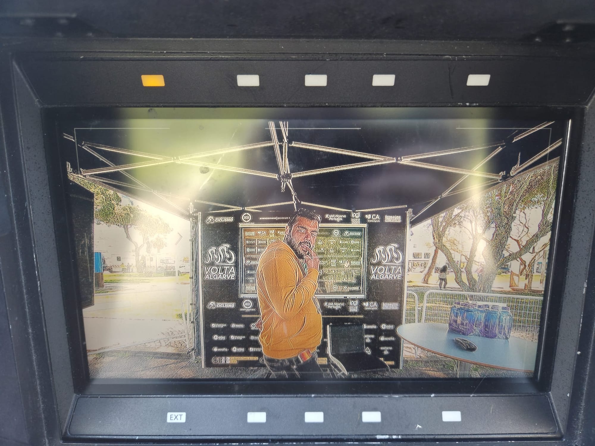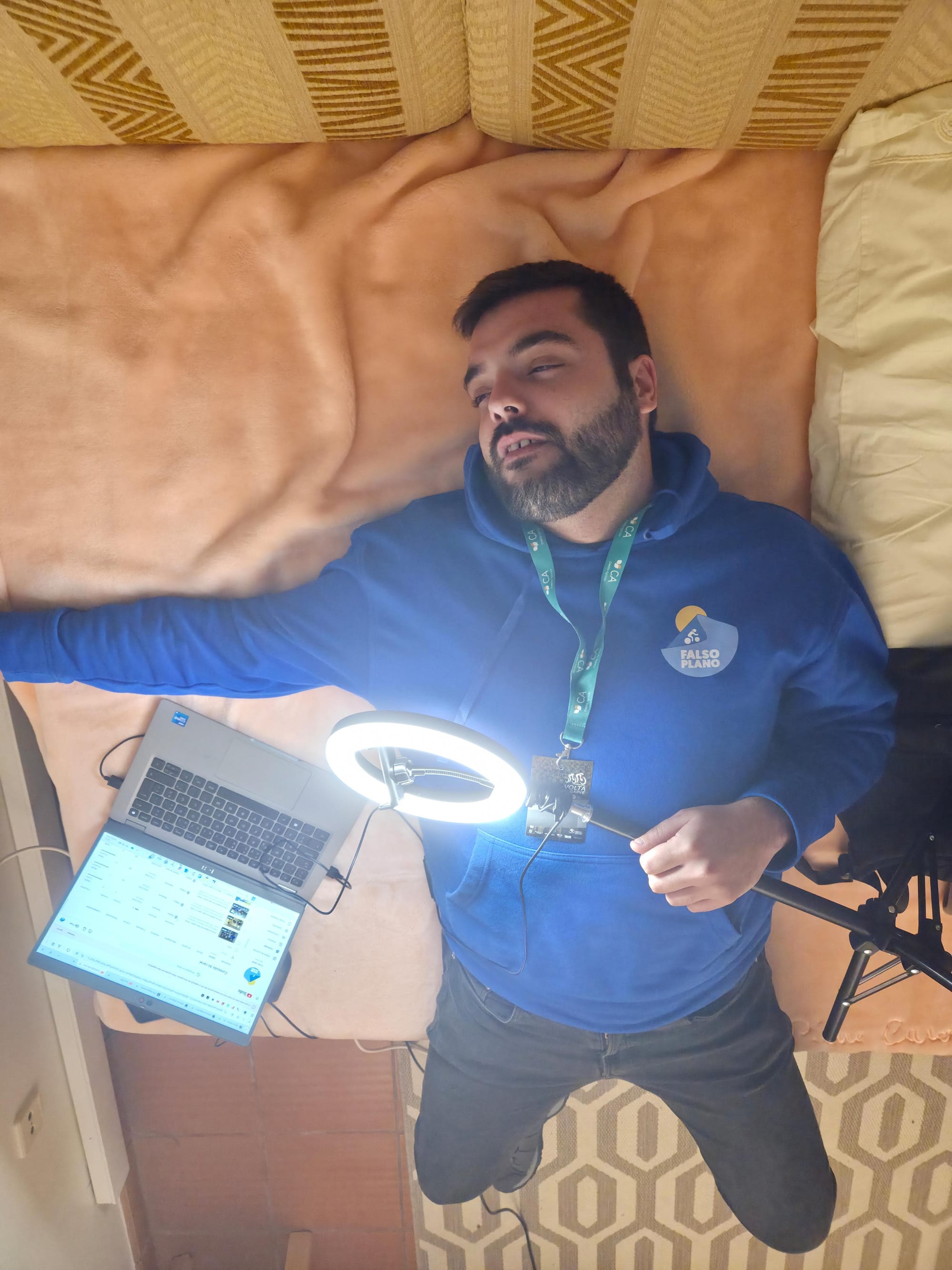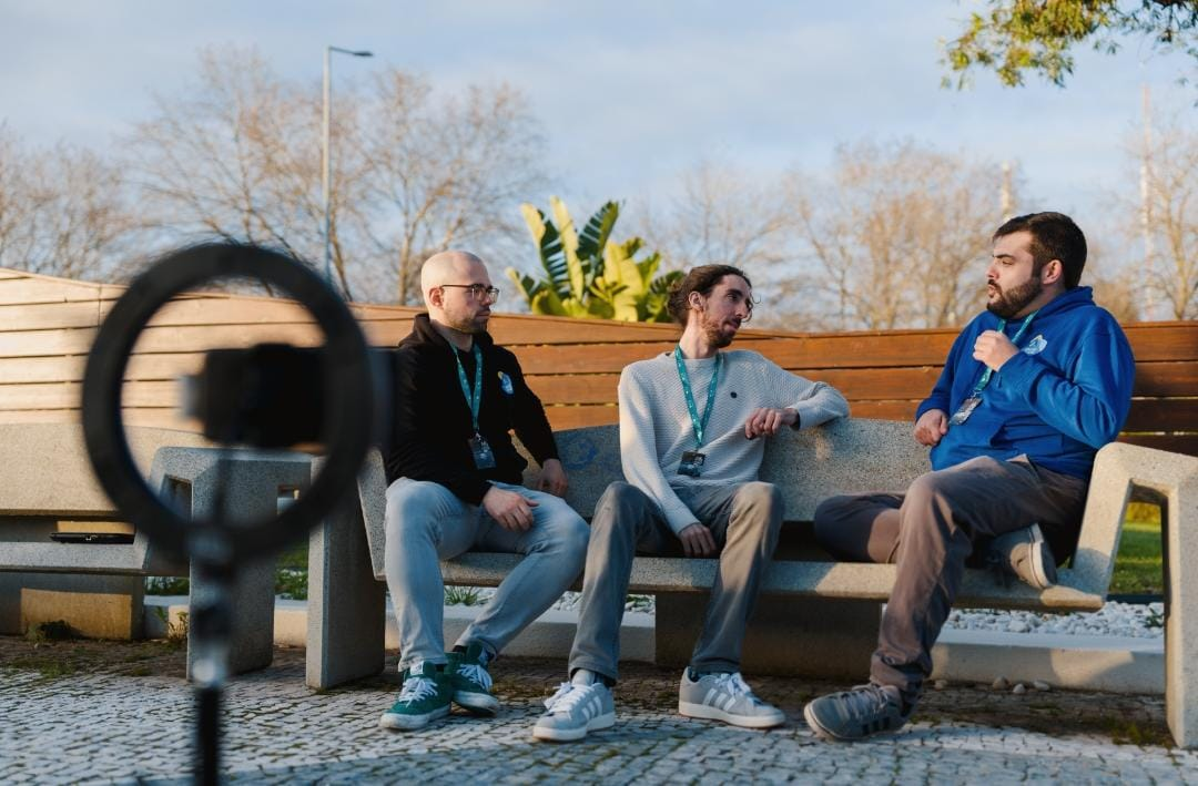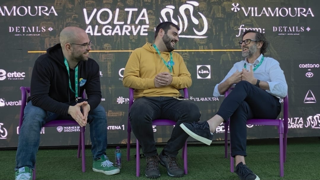 Quando chegámos à sala já tínhamos acreditações, por isso na nossa cabeça já éramos os reis daquilo tudo. Nuno Silva, um dos heróis desta epopeia, disparava rumo a Ezequiel Mosquera e eu ia apresentar-me convenientemente ao Vasco e ao Rafa, seu companheiro, igualmente simpático, igualmente obcecado por este desporto. "Então mas vamos gravar onde? Ai é como nós quisermos? Está bem, está." Seguimos então para montar o nosso estúdio, composto por um tripé daqueles com luzinhas de influencers, um telemóvel e dois microfones. Se isto não é tecnologia de ponta, não sei onde estão os vossos parâmetros. Um banco de jardim à frente do edifício pareceu-nos bom o suficiente. Era bom o suficiente, aliás, como provámos ao longo da semana, qualquer sítio era bom o suficiente. Aparece-nos pela frente mais um doente de ciclismo, que bom é passear por entre gente desta, espécie que julgava rara. Rodrigo Rodrigues aparece com uma câmara a sério a dizer que nos vem tirar umas fotos. Malta, temos as primeiras fotos oficiais falso plano. Mãe, vê lá se o teu filho não está mêm com classe.