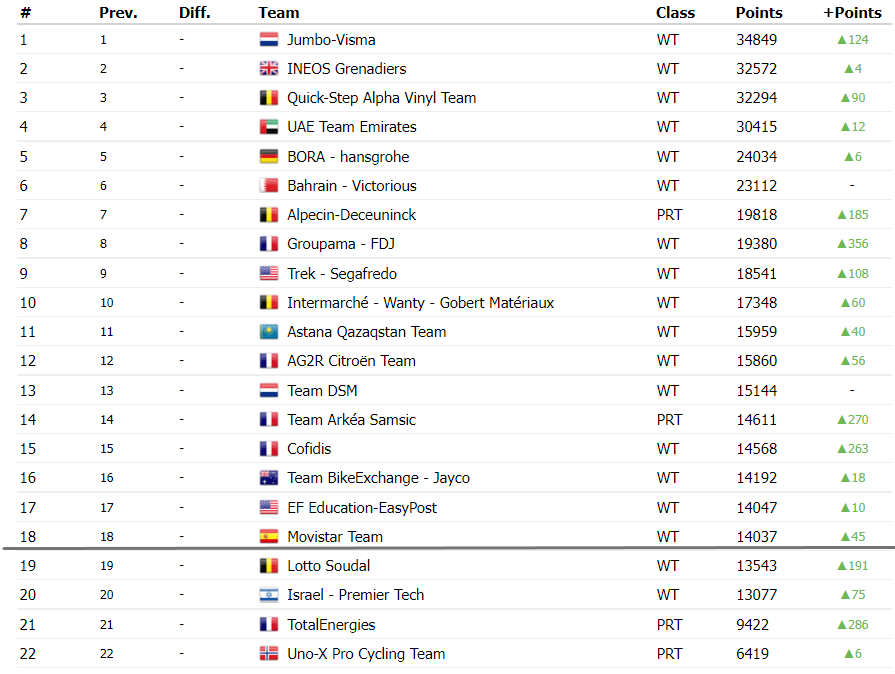 A Movistar e a BikeExchange têm muitas fichas apostadas no resultado desta Vuelta por Enric Mas e Simon Yates, enquanto que a Lotto se foca nas clássicas e corre às cavalitas de Arnaud De Lie (que sem ter qualquer ponto em provas WT é 10º classificado individualmente) e a EF tenta usar o seu plantel versátil para ir marcando pontos em várias corridas. Teremos uma discussão acérrima até às ultimas corridas de Outubro.