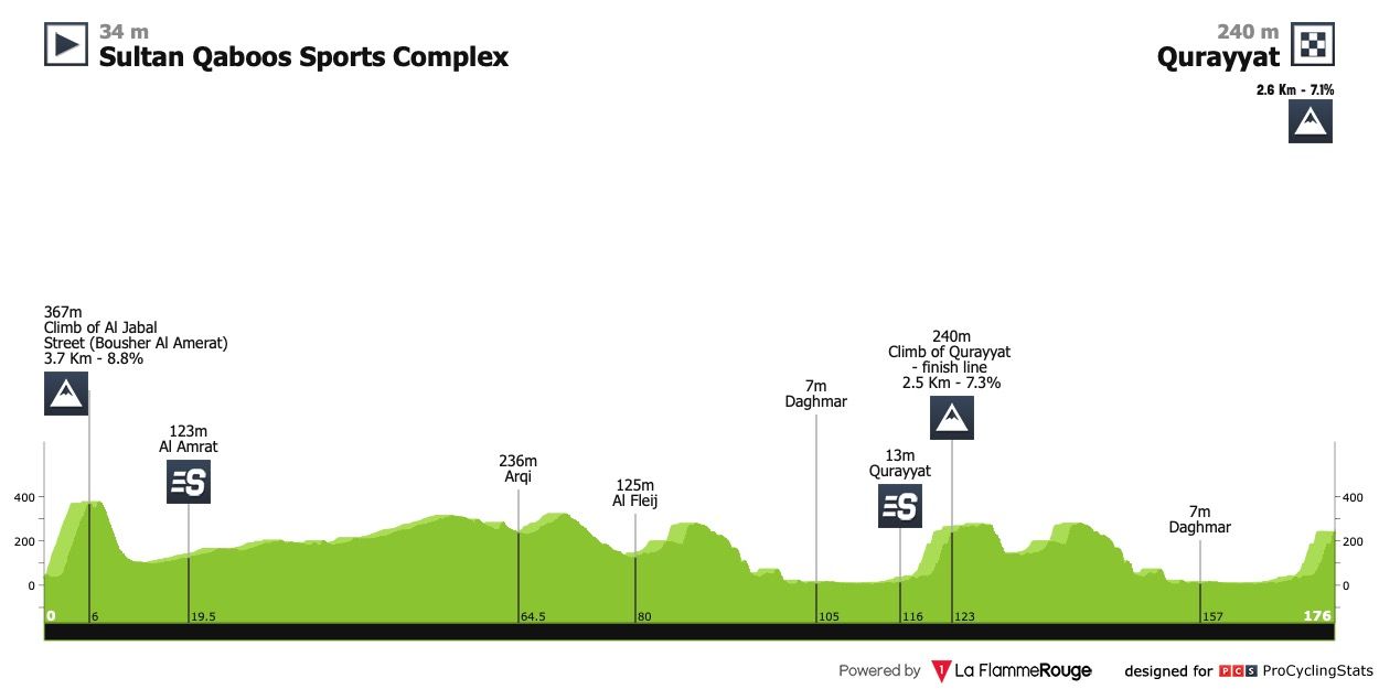 - Etapa 2 — Ao segundo dia começa a festa para puncheurs e trepadores. Dia com percurso de altos e baixos que começa logo com uma subida ao Al Jabal Street de 3.7 quilómetros a 8.8% para mais à frente termos a primeira passagem pela subida da meta, Quarayyat, que conta com 2.6 quilómetros a 7%. Esta tirada promete um final bastante animado.