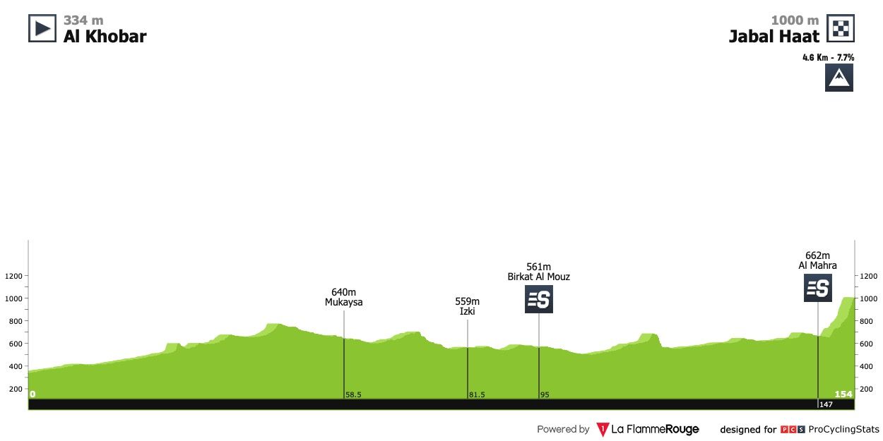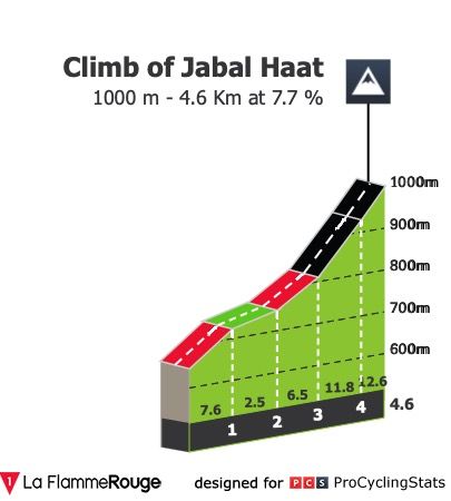 - Etapa 3 — Terreno tranquilo, ou seja dia de poder dormir até aos últimos quilómetros, onde teremos uma subida a 1000 metros de altitude, Jabal Haat. Serão 4.6 quilómetros com uma média de 7.7% de inclinação. De referir que no último quilómetro chegaremos a ter uma secção com percentagem de 12.6. Vai ser durinho.