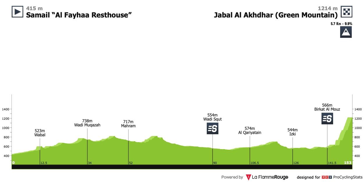 - Etapa 5 — Derradeira etapa e que provavelmente irá definir o vencedor. Os ciclistas vão subir aos 1200 metros de altitude em Jabal Al Akhdhar, serão 5.7 quilómetros percorridos num falso plano com média de 9.9%.