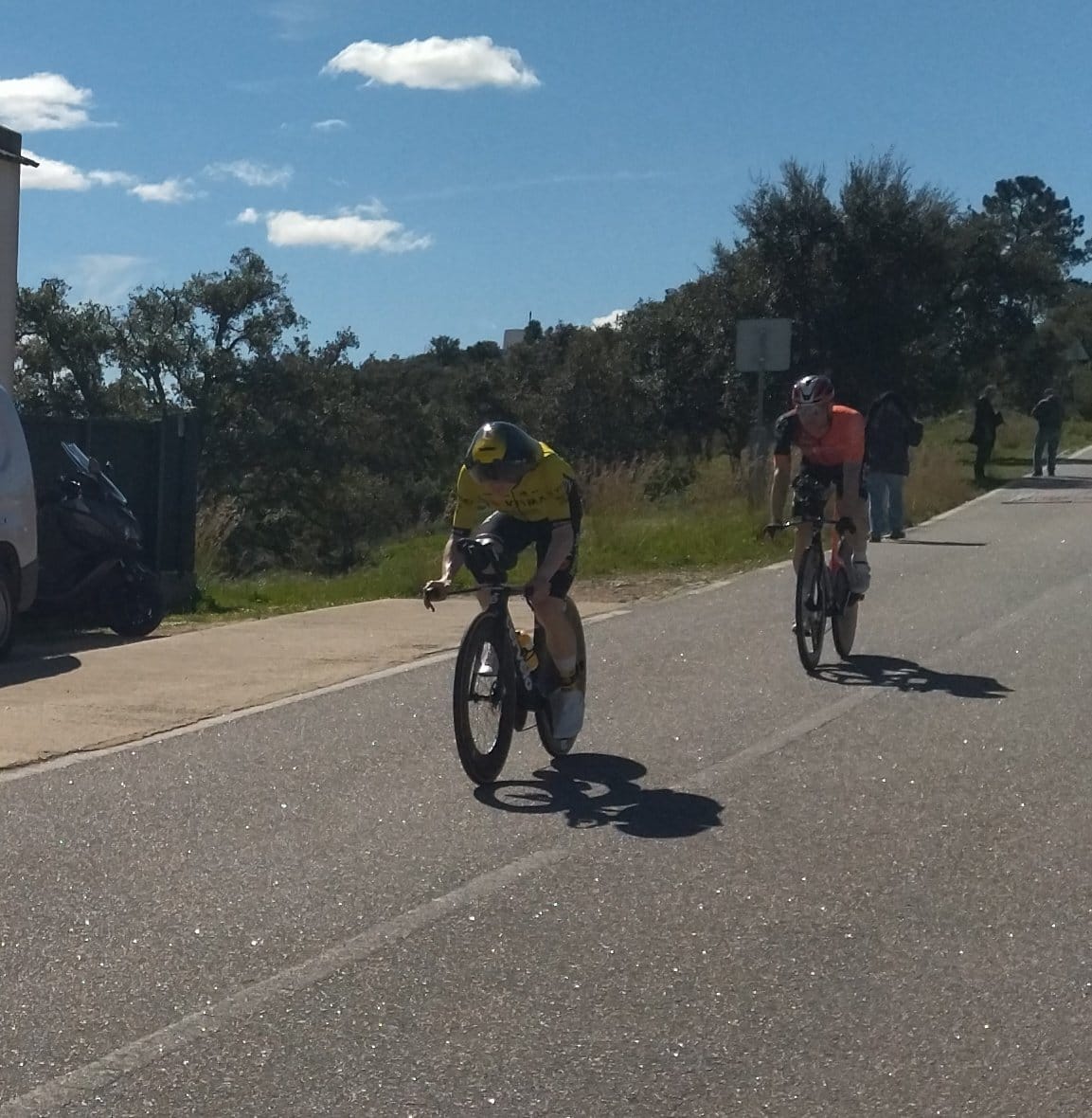 Os ciclistas começaram a passar e nós fomos apoiando quase todos. A subida do Malhão é tão dura que considerámos importante dar uma palavra de conforto — um "anda lá, Bruttomesso, o Dias tem-te na fantasy"; um "Ó Noah tens de dar mais, Noah, anda lá"; um "RAFA, hoje é teu RAFA", coisas assim, muito motivadoras e compreensivas. E assim foi decorrendo a etapa, o sol não deu descanso, o calor era intenso, fomos fazendo amigos, as pessoas foram engraçando connosco, com a nossa forma de falar, com o nosso jeito para beber canecos, com as nossas sandes aprumadas. Ainda metemos José Mário Branco para ver se os ciclistas ganhavam uma força extra naquelas pendentes tórridas.