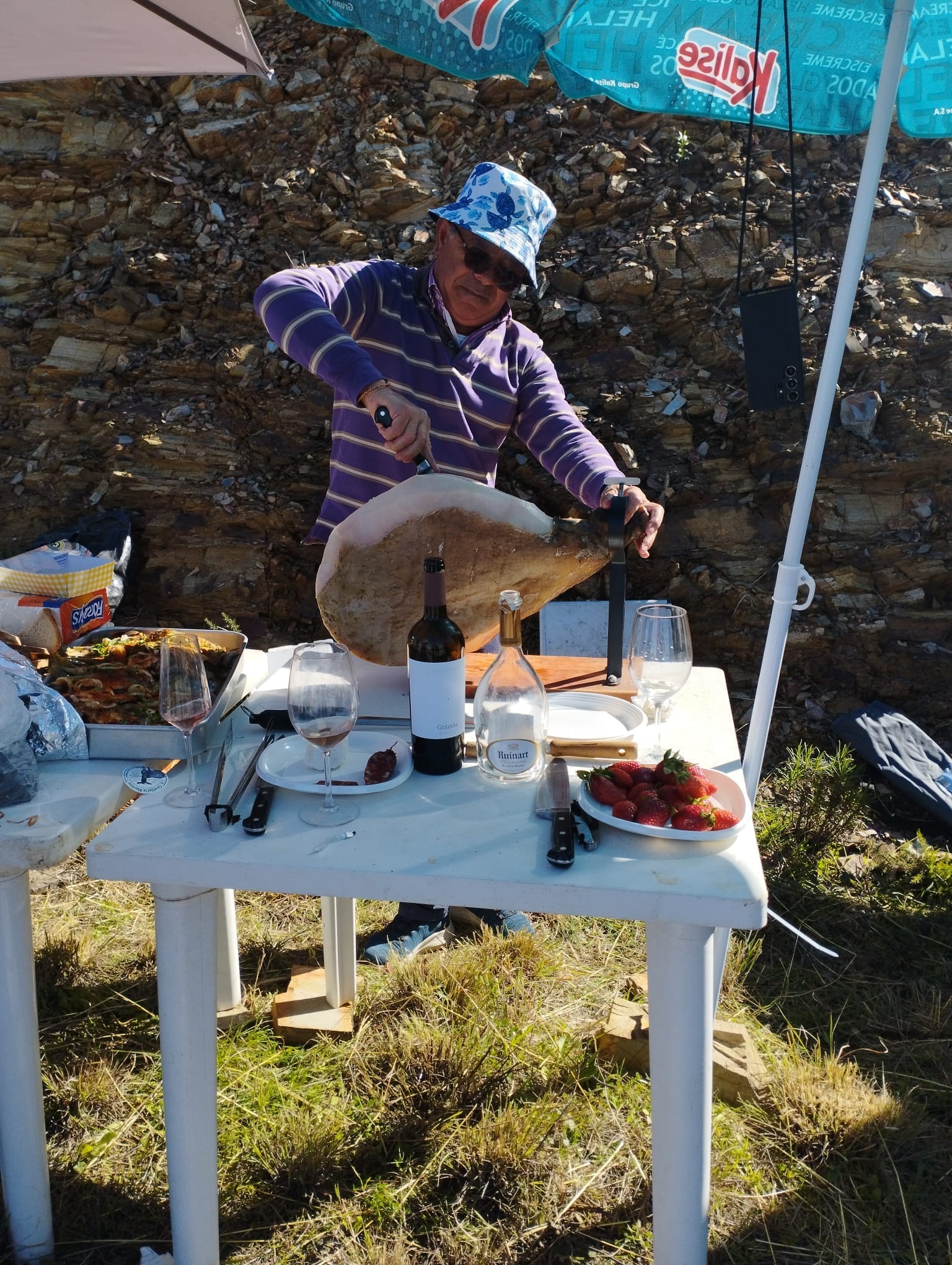 Pouco depois fomos fazer o reconhecimento, avisando que voltaríamos. No fundo, fomos escolher qual seria a curva falso plano. E minha mãe, que paisagem deliciosa encontrámos no Malhão. Inclusive, um grupo de profissionais do farnel e petisco ambulante, com direito a perna de presunto e vinho fresco logo pela manhã. Pedimos para tirar uma fotografia com a esperança de que nos oferecessem um bocado de presunto, mas tal não aconteceu.