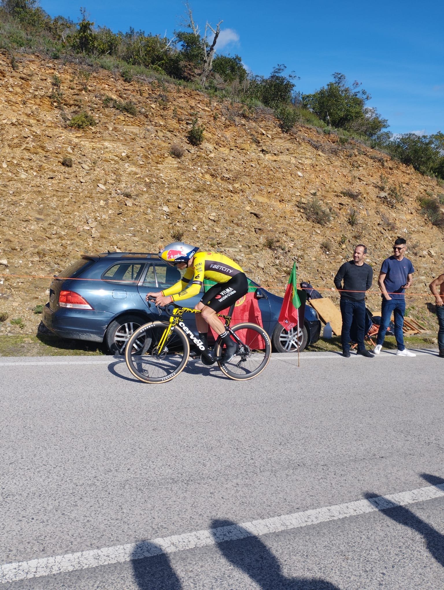 Claro que neste momento o Henrique tinha ido aos lavabos, se não teria percebido que a vitória de Vingegaard estava garantida. Nessa altura, eu e o Henrique estávamos já na companhia do senhor Luís, um algarvio na casa dos 60 anos com uma paixão enorme pelo ciclismo. Veio perguntar-nos a que horas partia o primeiro ciclista e teve sorte porque nós sabíamos. E depois ainda nos deu uma lição de conhecimento de ciclismo, relembrando-nos que corredores da mesma equipa não podem partir de forma consecutiva num contrarrelógio e que por isso Jan Christen e João Almeida iam sair intervalados pelo Laurens De Plus apesar de serem primeiro e segundo à geral. E também foi o Luís que identificou Primož Roglič à distância quando eu e o Henrique dizíamos que era demasiado magro para ser o esloveno — provavelmente já não estaríamos com a nossa visão a 100%.